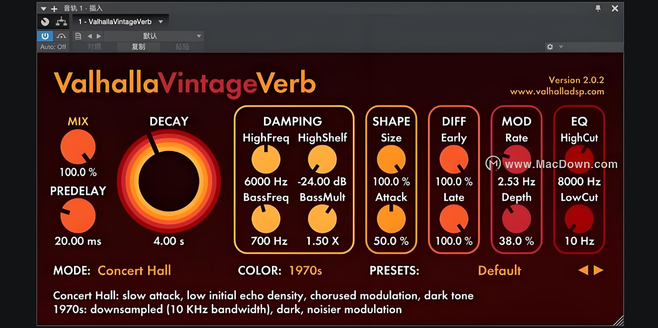 Valhalla VintageVerb 是Valhalla DSP推出的复古数字混响插件,版本V3.0.0于2023年发布,包含以下核心功能: